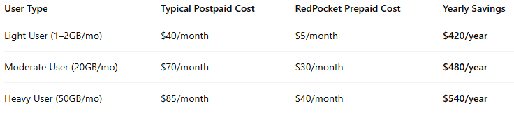 Savings formula: (Your current monthly bill – RedPocket plan) × 12 = Annual savings.