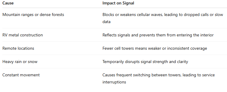 Spotty RV cell service is often caused by the metal structure of the vehicle, remote travel locations with fewer cell towers, and obstacles like trees or mountains that block or weaken the signal. Even weather conditions like rain or snow can impact reception.
